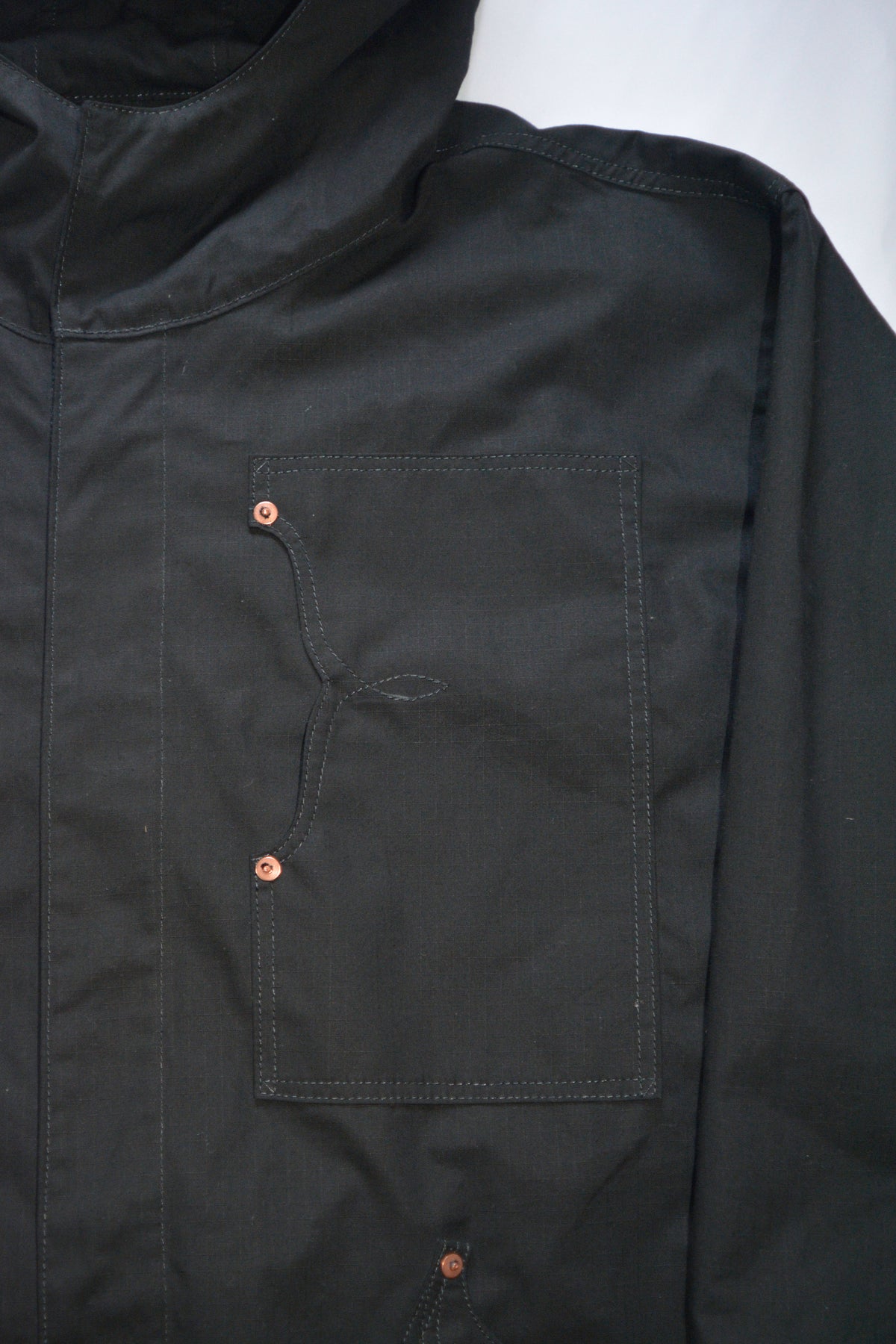 胸にはUS ARMY M-35 デニムプルオーバーに使われていた内側からモノを入れられる仕様のポケット、フロント下部分にはTom worksの代表的なポケットが付いています。
