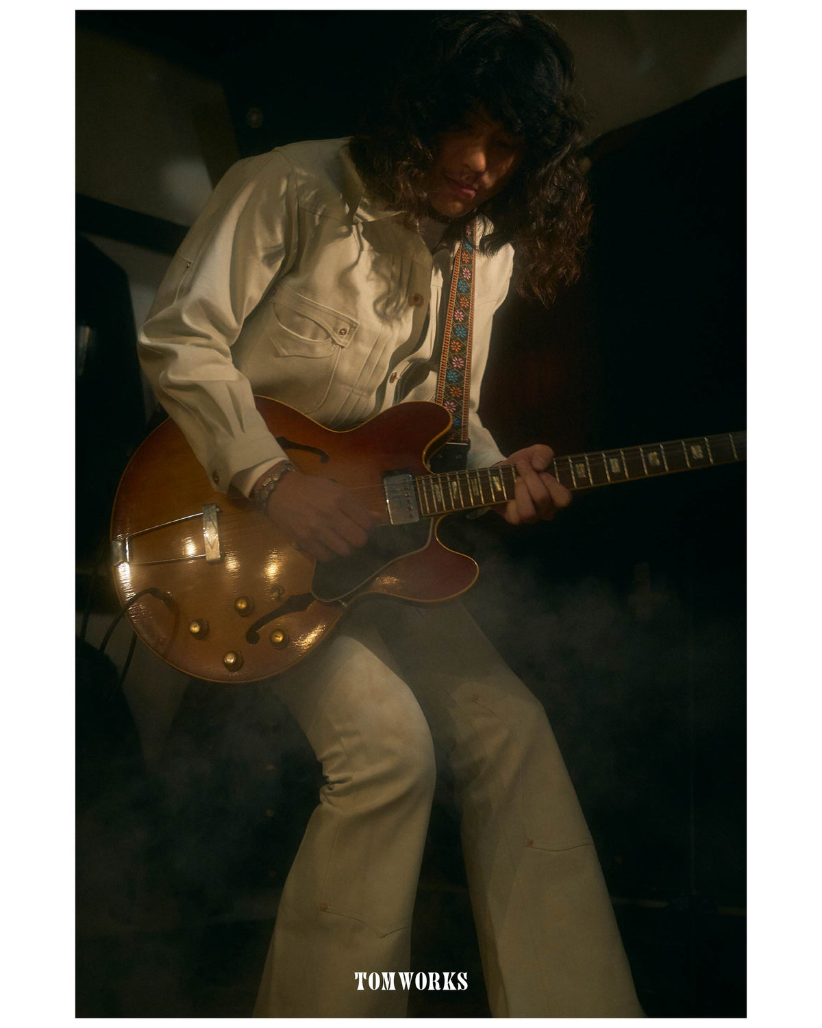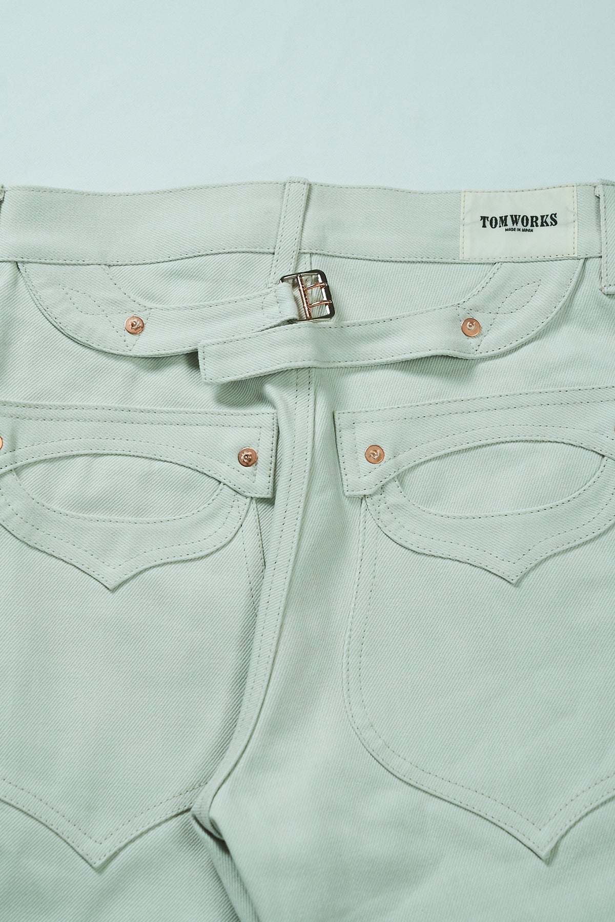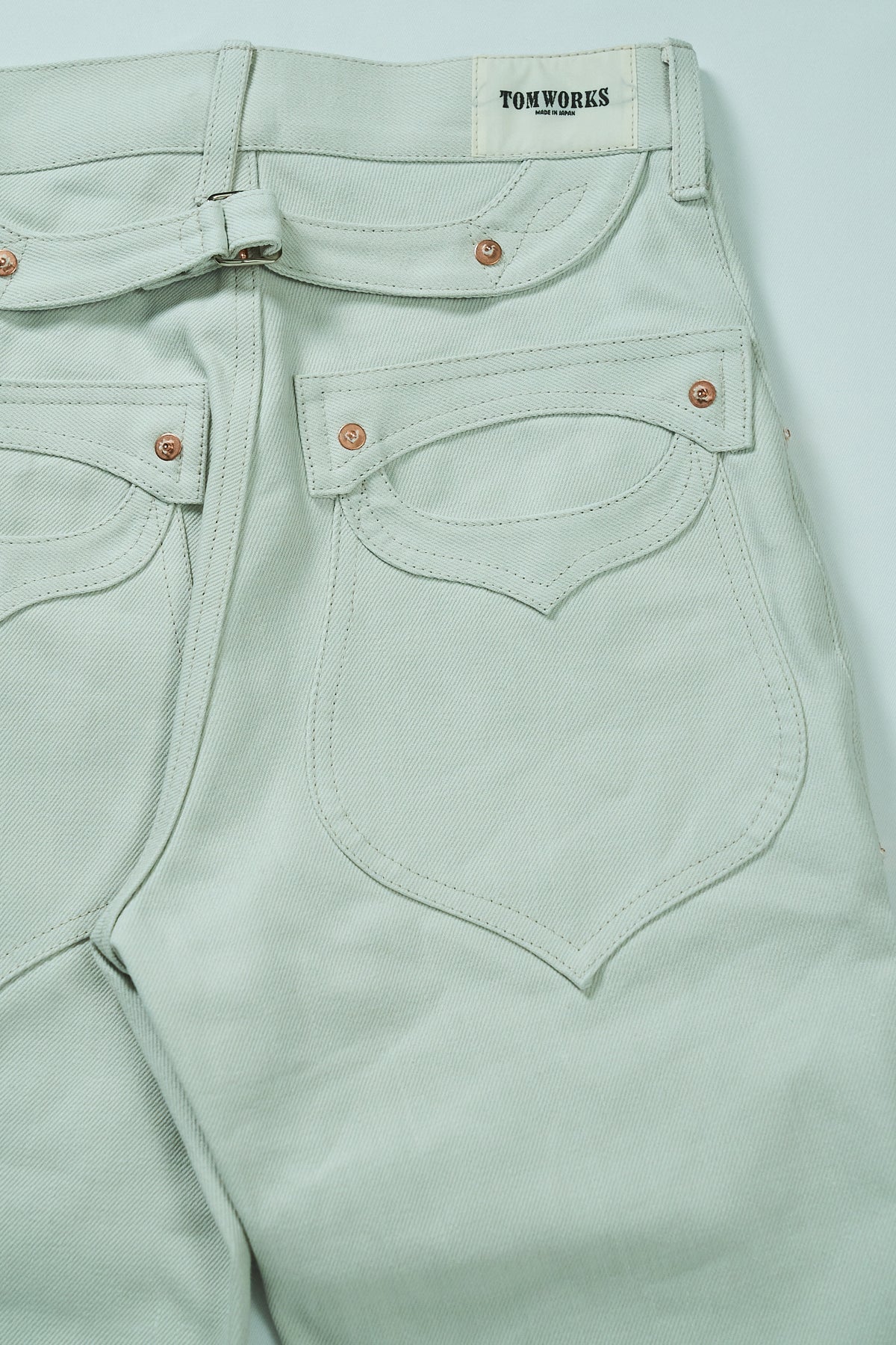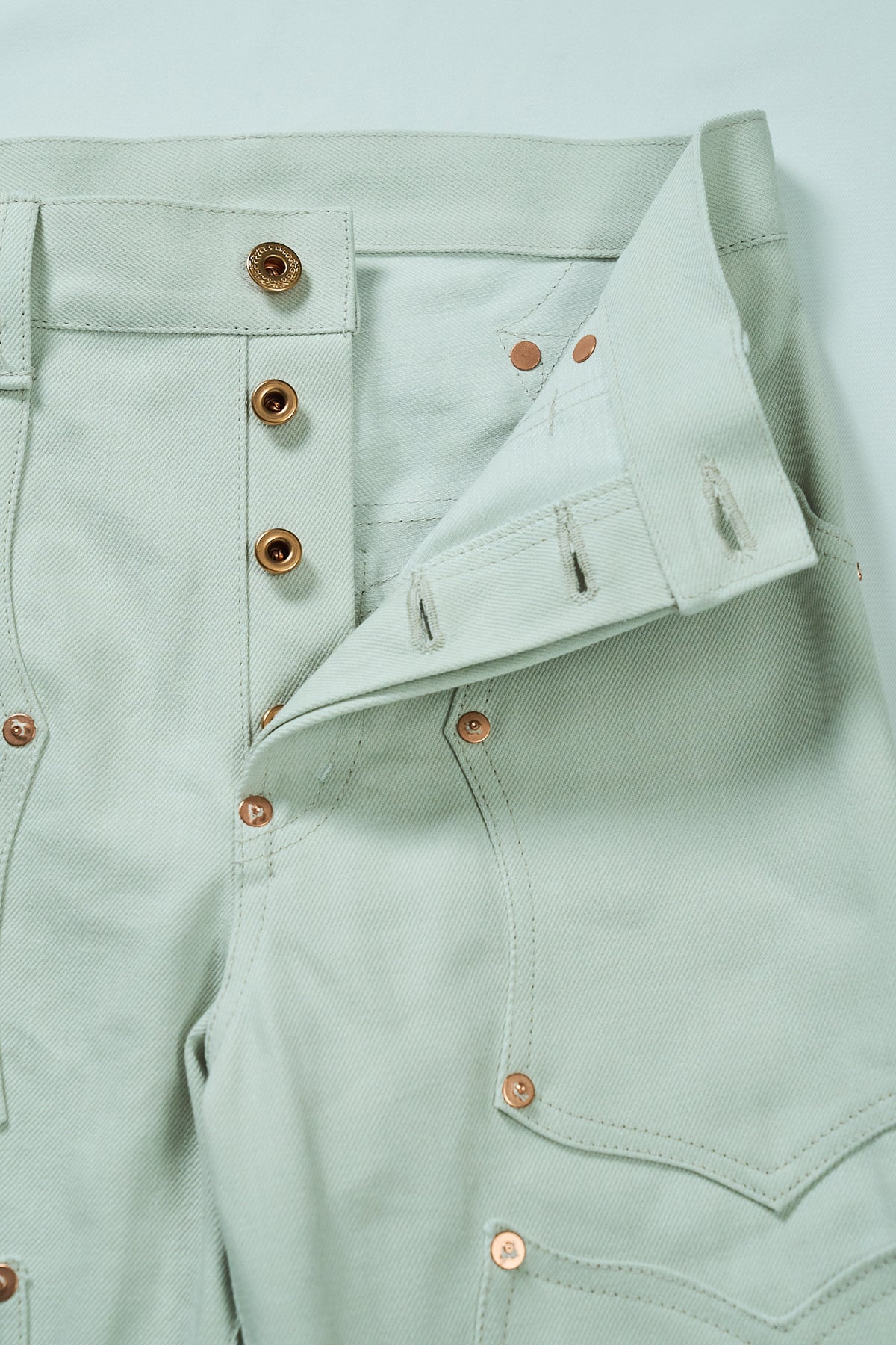 フロントポケットやニーパッチ、シンチバックにはリーフステッチが入りアンティークな雰囲気もありつつ、ヴィンテージ色の強い仕上がりとなっています。