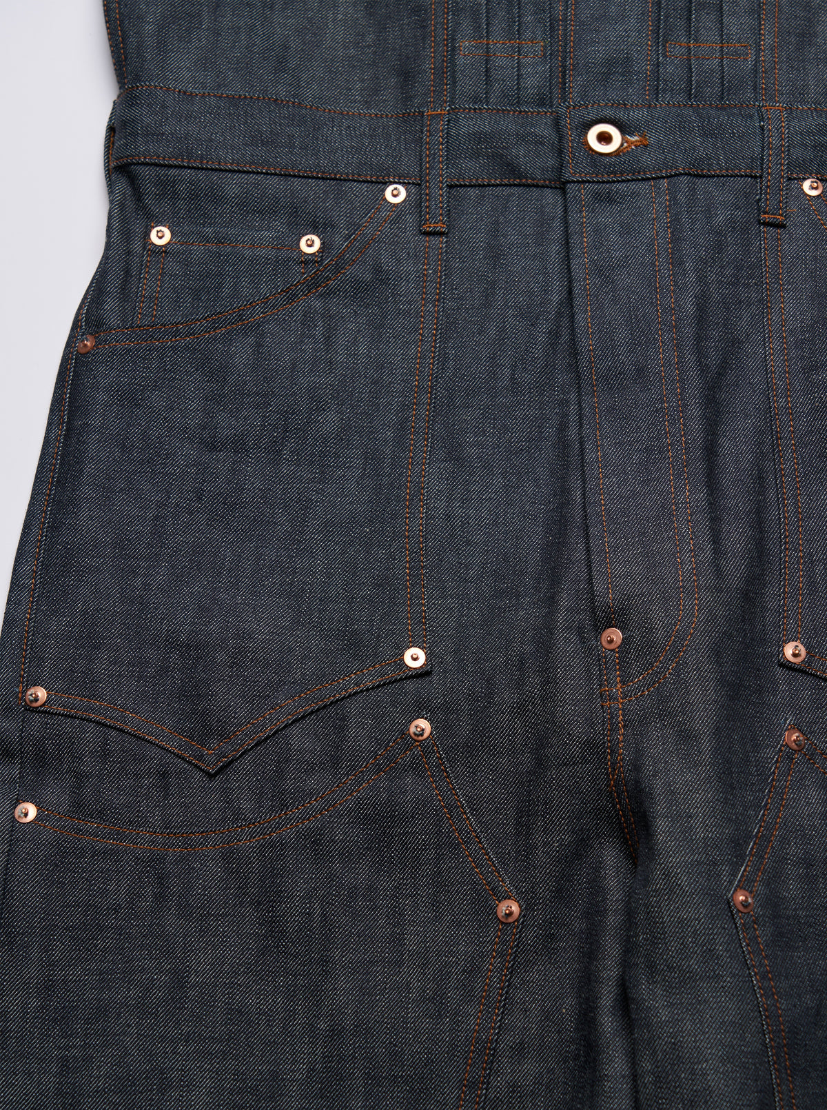 The elbows and knees are reinforced with classic design patches, and the copper buttons and rivets will develop a unique patina over time as the fabric ages.
