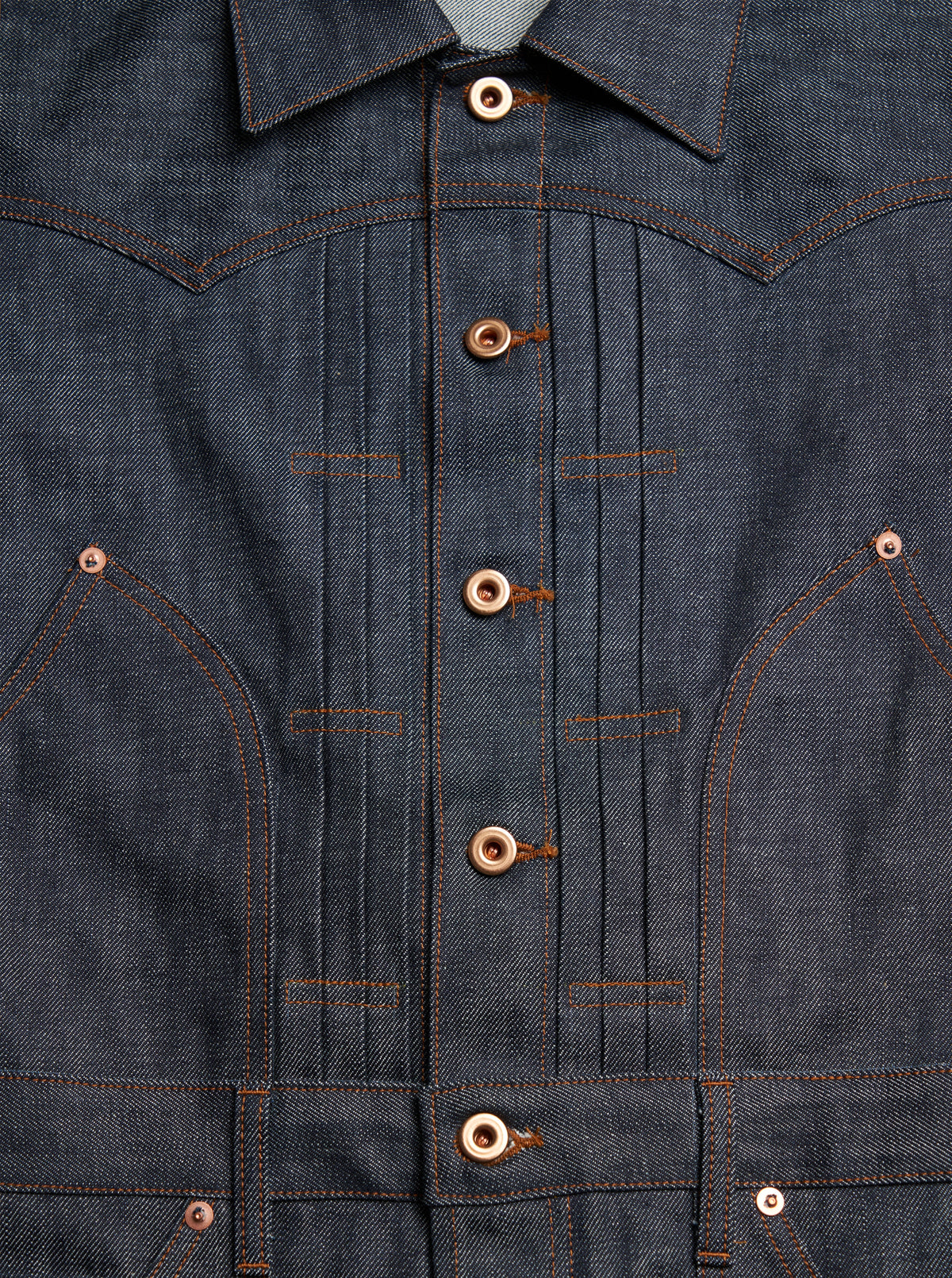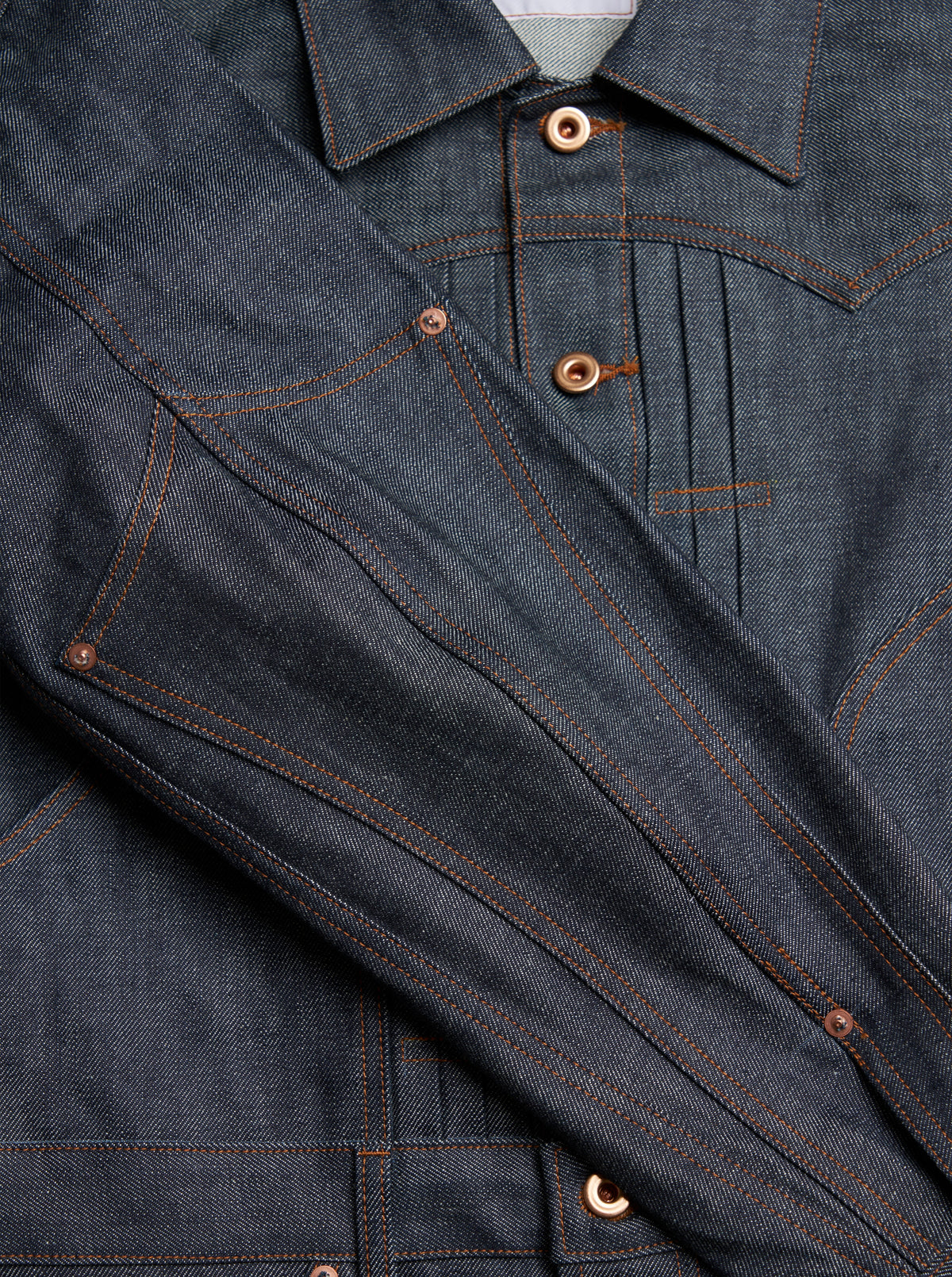 The indigo fabric is made from 100% long-staple Zimbabwe cotton for the warp threads, which gives it a distinctive uneven texture with medium and short pitch variations. The rope-dyed indigo has a greenish tint.
