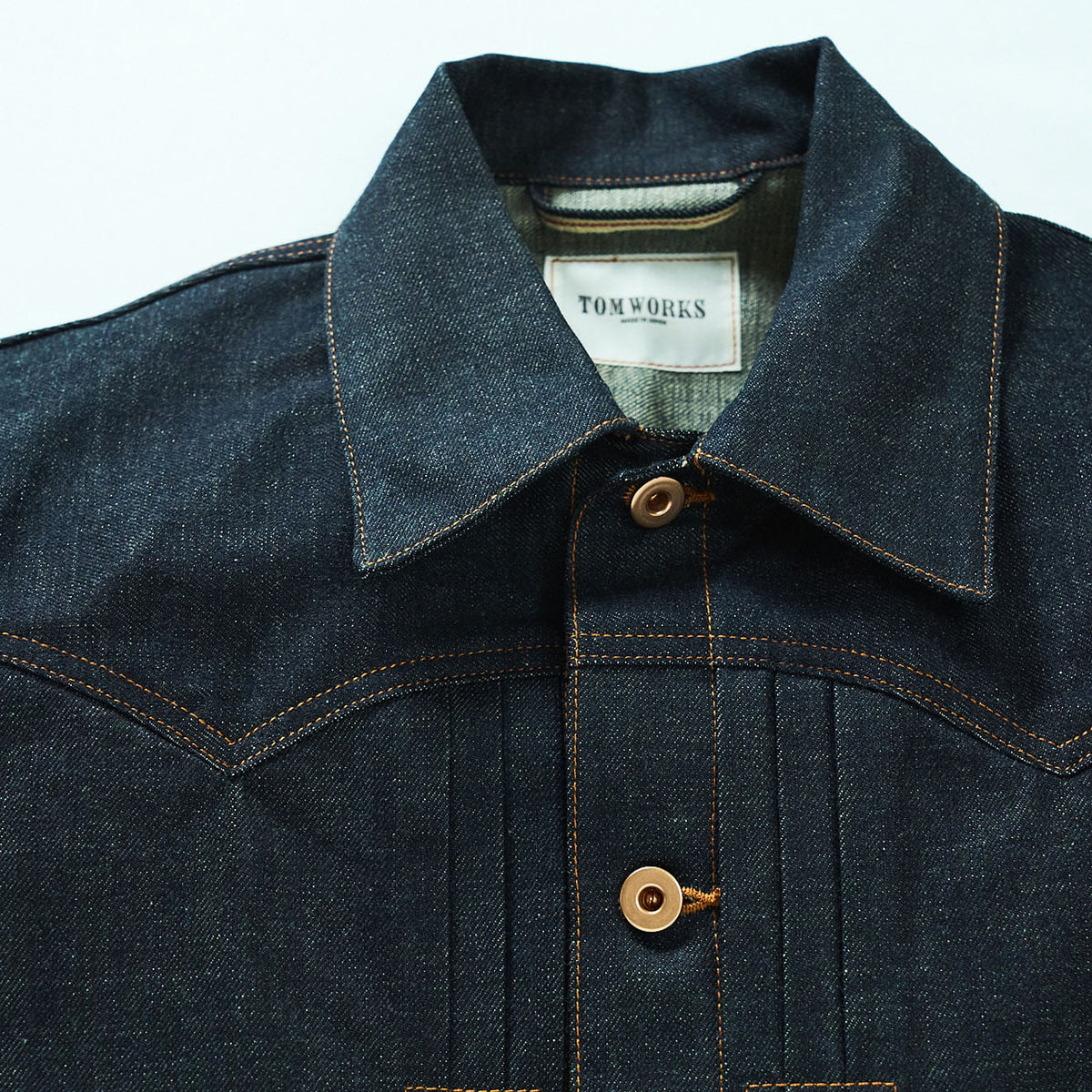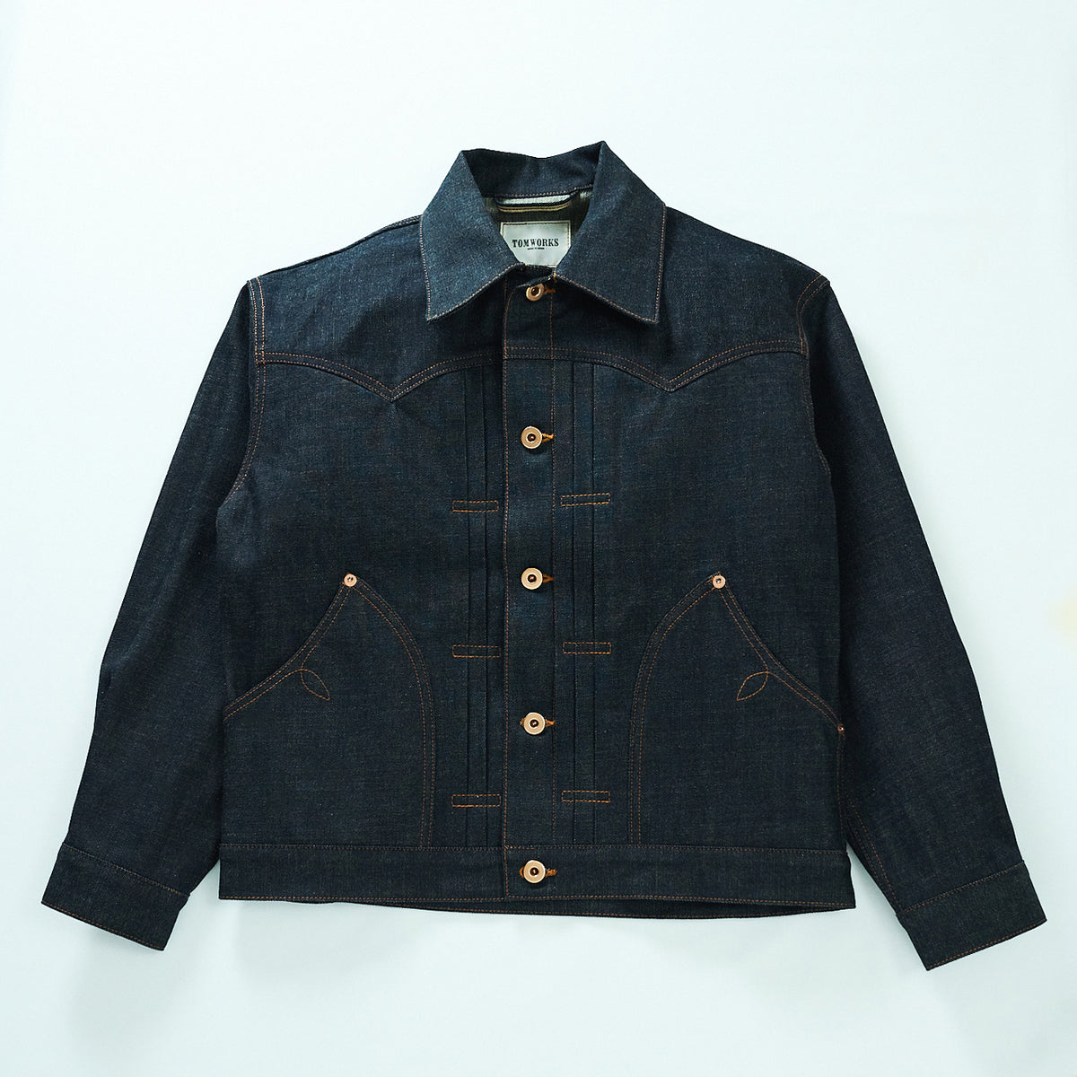 Tomworksの代表的なフロントポケット、大きめの襟、3本タックが印象的なアンティークな雰囲気が漂うジャケット。