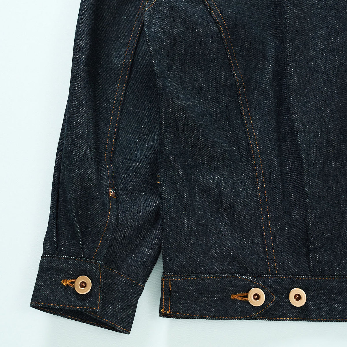 リベットやドーナツボタンは光沢のある銅素材のものを使用。
