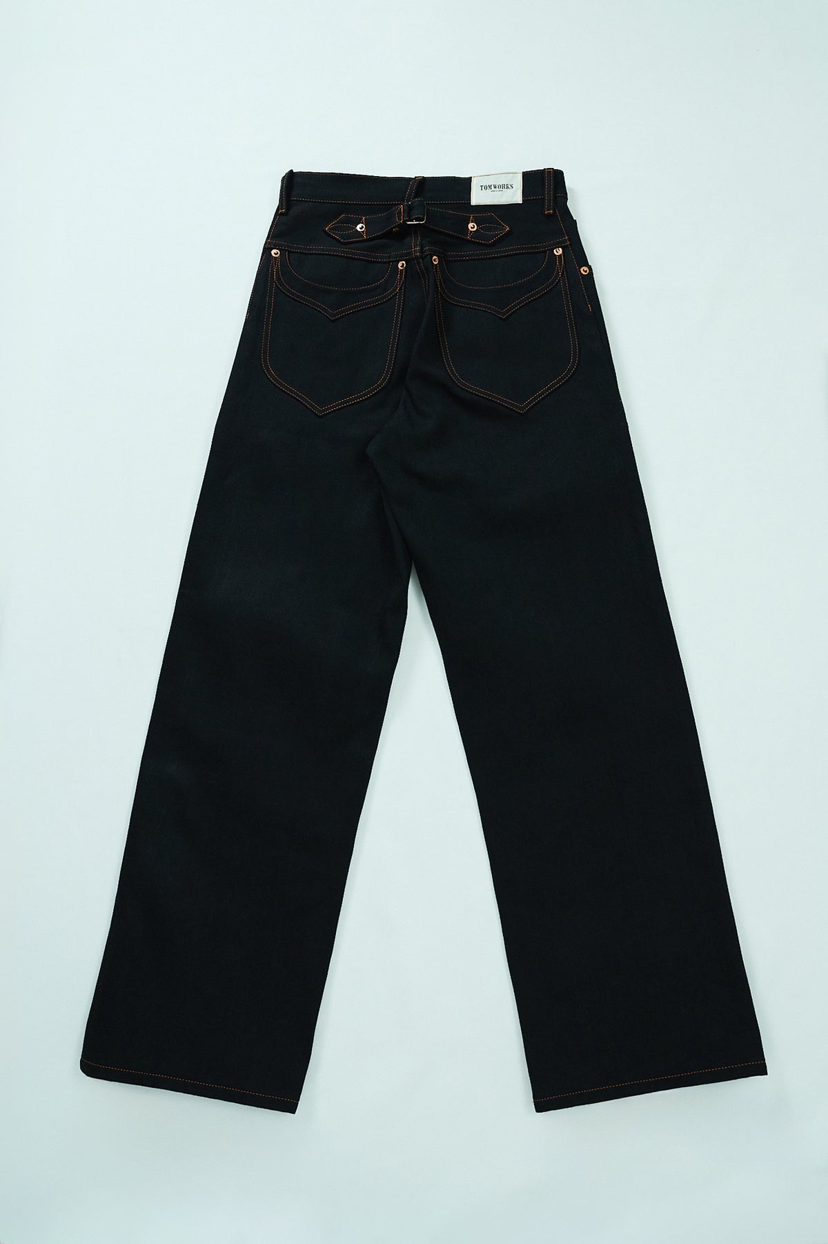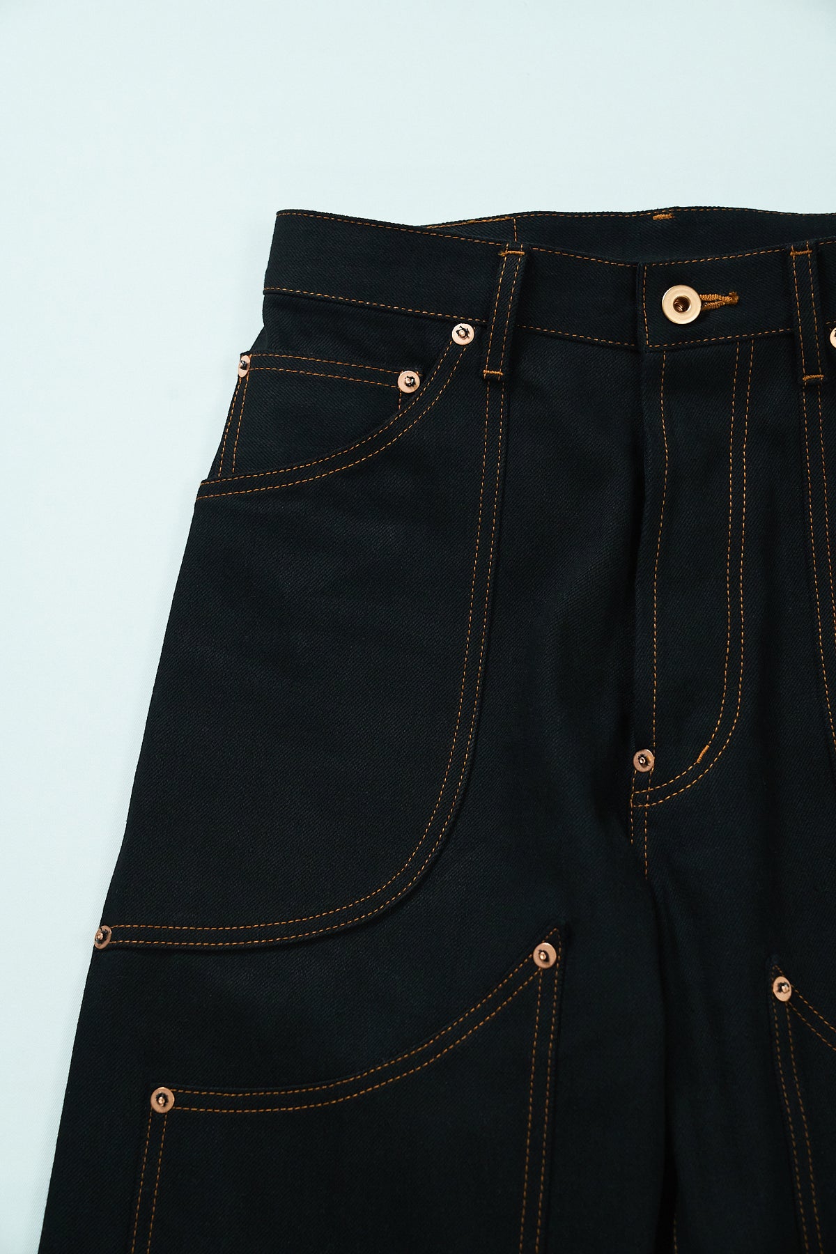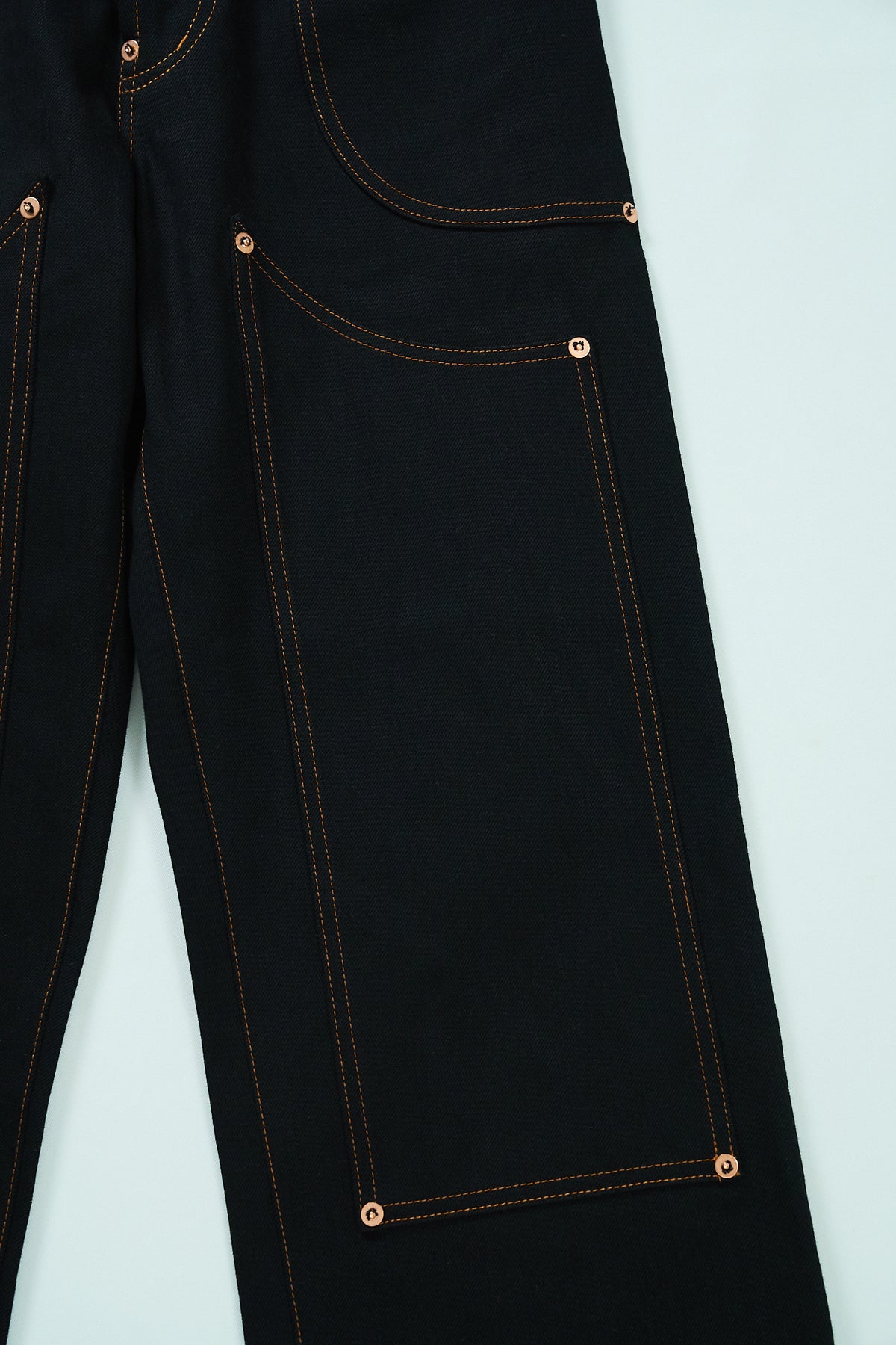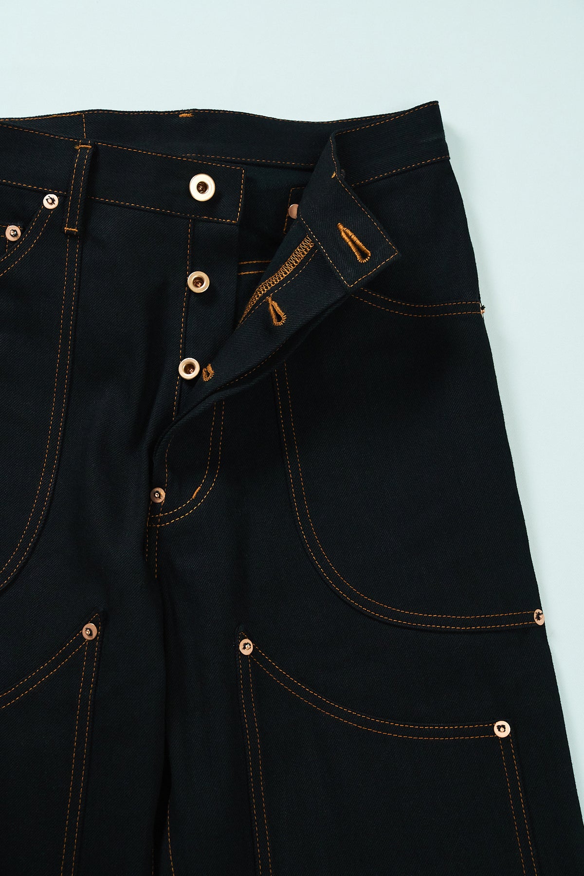 表も裏も真っ黒な生地、リベットやドーナツボタンは光沢のある銅素材のものを使用する事に引き締まった印象に。